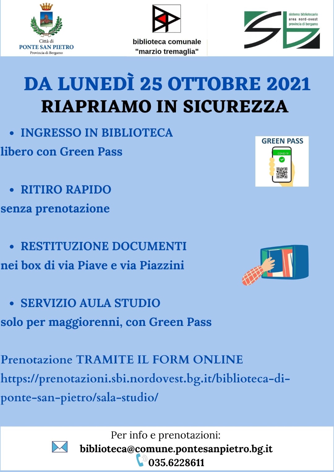 Da lunedì 25 ottobre la biblioteca riapre in sicurezza i seguenti servizi: - ingresso in biblioteca senza prenotazione con green pass; - servizio aula studio solo per maggiorenni con green pass, tramite prenotazione online (vedi form allegato); - ritiro rapido senza appuntamento di libri, dvd e riviste prenotati; - restituzione documenti nei box di via Piave e via Piazzini.