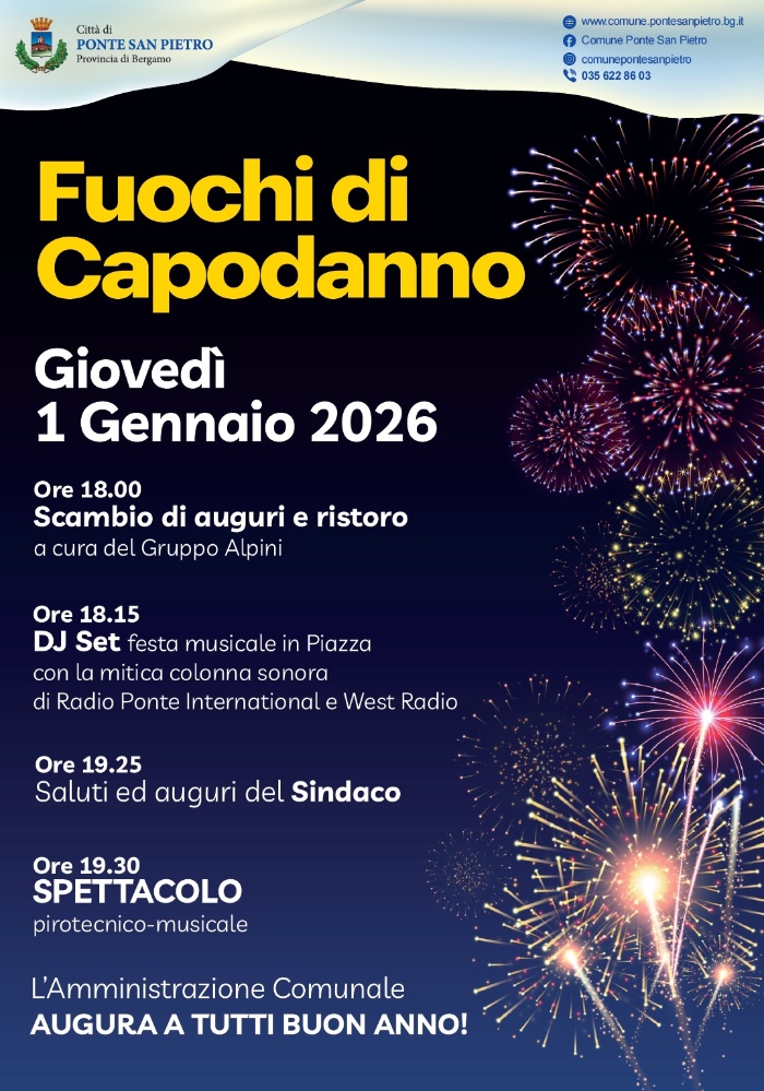 Dettagli dell'evento Ore 18.00: scambio di auguri e ristoro Ore 18.15: DJ set in Piazza Ore 19.25: auguri del Sindaco Ore 19.30: spettacolo pirotecnico-musicale