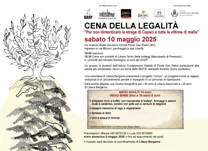 Sabato 10 maggio 2025, si svolgerà alle 19:00, presso l'oratorio maschile Beato Giovanni XXIII (via Moroni, Ponte San Pietro), la Cena della Legalità, con prodotti di Libera Terra e del Mercato briologico a cura del GASP.