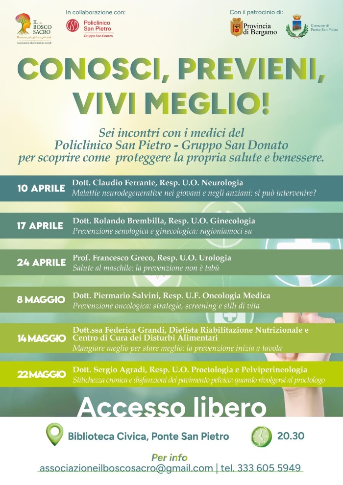 L’iniziativa prevede sei serate informative aperte alla cittadinanza, dedicate alla prevenzione e alla tutela della salute, con la partecipazione di medici specialisti che approfondiranno tematiche di grande interesse: dalle malattie neurodegenerative alla prevenzione ginecologica, dalla salute maschile alla prevenzione oncologica, fino all’alimentazione e ai disturbi del pavimento pelvico.