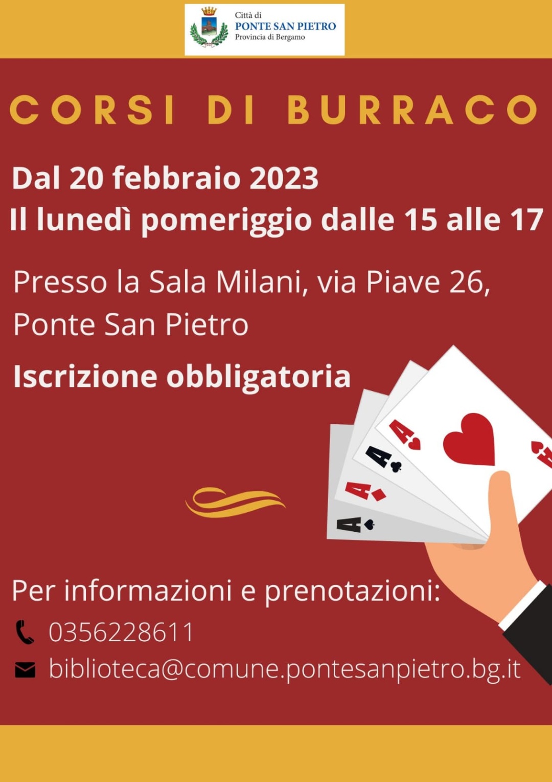 Dal 20 febbraio, la Biblioteca comunale organizza un corso di burraco, che si terrà presso la Sala F.lli Milani (Via Piave, 26) il lunedì pomeriggio dalle ore 15 alle 17. Iscrizione obbligatoria