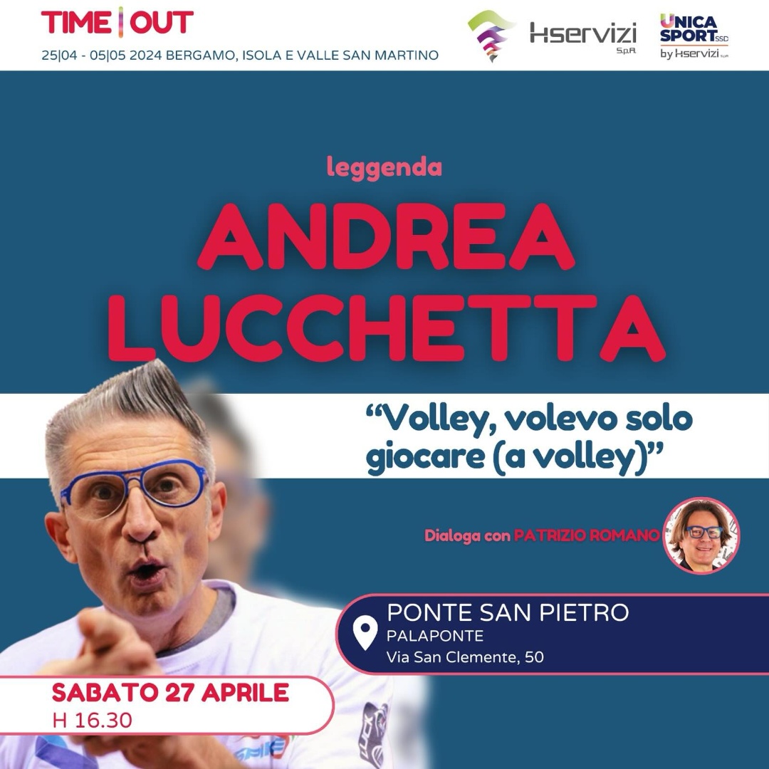 Andrea LUCKY Lucchetta, capitano della “Generazione di fenomeni” di pallavolo, sarà a Ponte San Pietro sabato 27 aprile alle 16.30 presso il PalaPonte nell’ambito del Festival sportivo “TimeOut” promosso da Hservizi e Unica Sport con i Comuni dell’Isola Bergamasca. Lucchetta dialogherà con Patrizio Romano e molto altro.