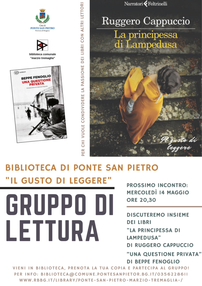 Dettaglio dell'evento Mercoledì 14 maggio 2025, ore 20:30, si discuterà dei seguenti libri: "Una questione privata" di Beppe Fenoglio "La principessa di Lampedusa" di Ruggero Cappuccio.