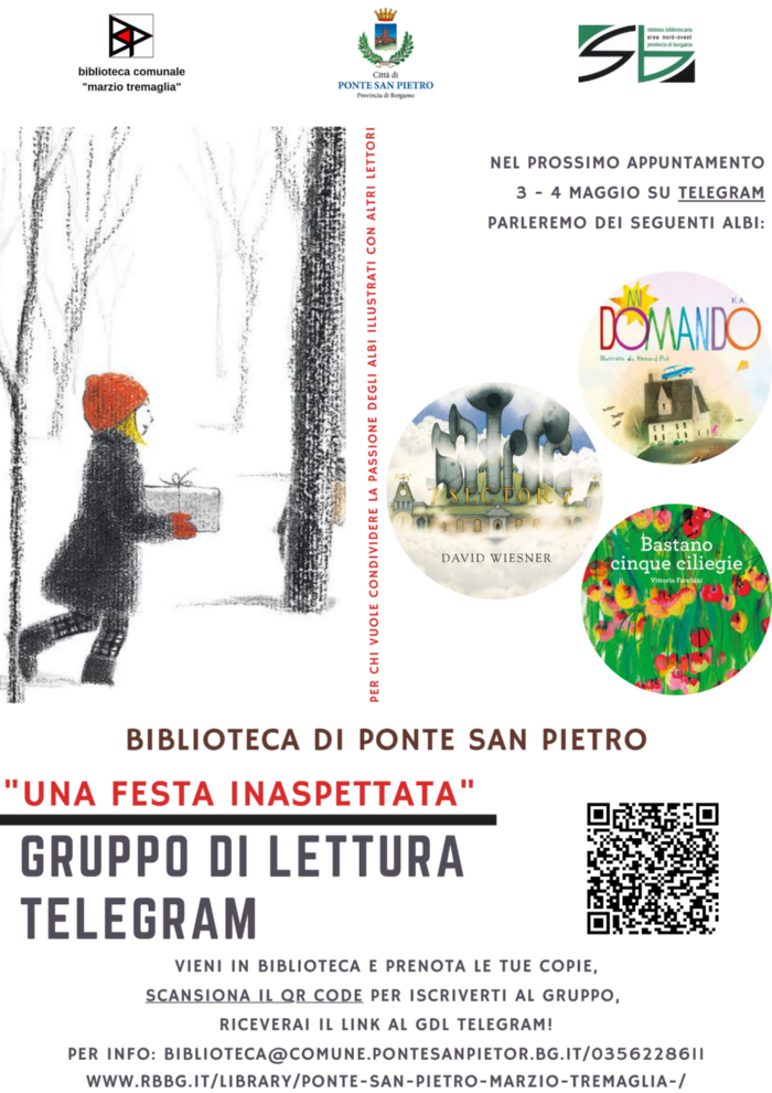 Dettagli dell'evento Sabato 3 e domenica 4 maggio 2025, su Telegram, si parlerà dei seguenti albi: "Mi domando" di Kari Anne Holt "Sector 7" di David Wiesner "Bastano cinque ciliegie" di Vittoria Facchini.