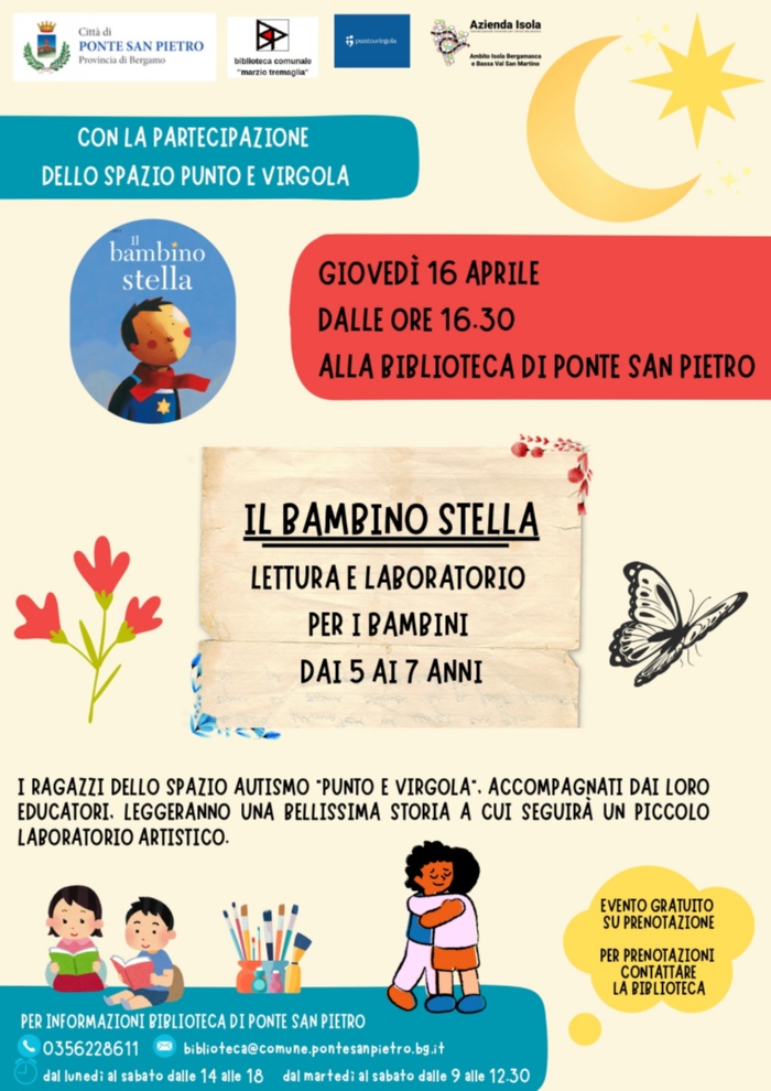 Giovedì 16 aprile, dalle 16.30 alle 18, presso la biblioteca di Ponte San Pietro, verrà letta la storia "Il bambino stella" e, a essa, seguirà un laboratorio per i bambini dai 5 ai 7 anni.