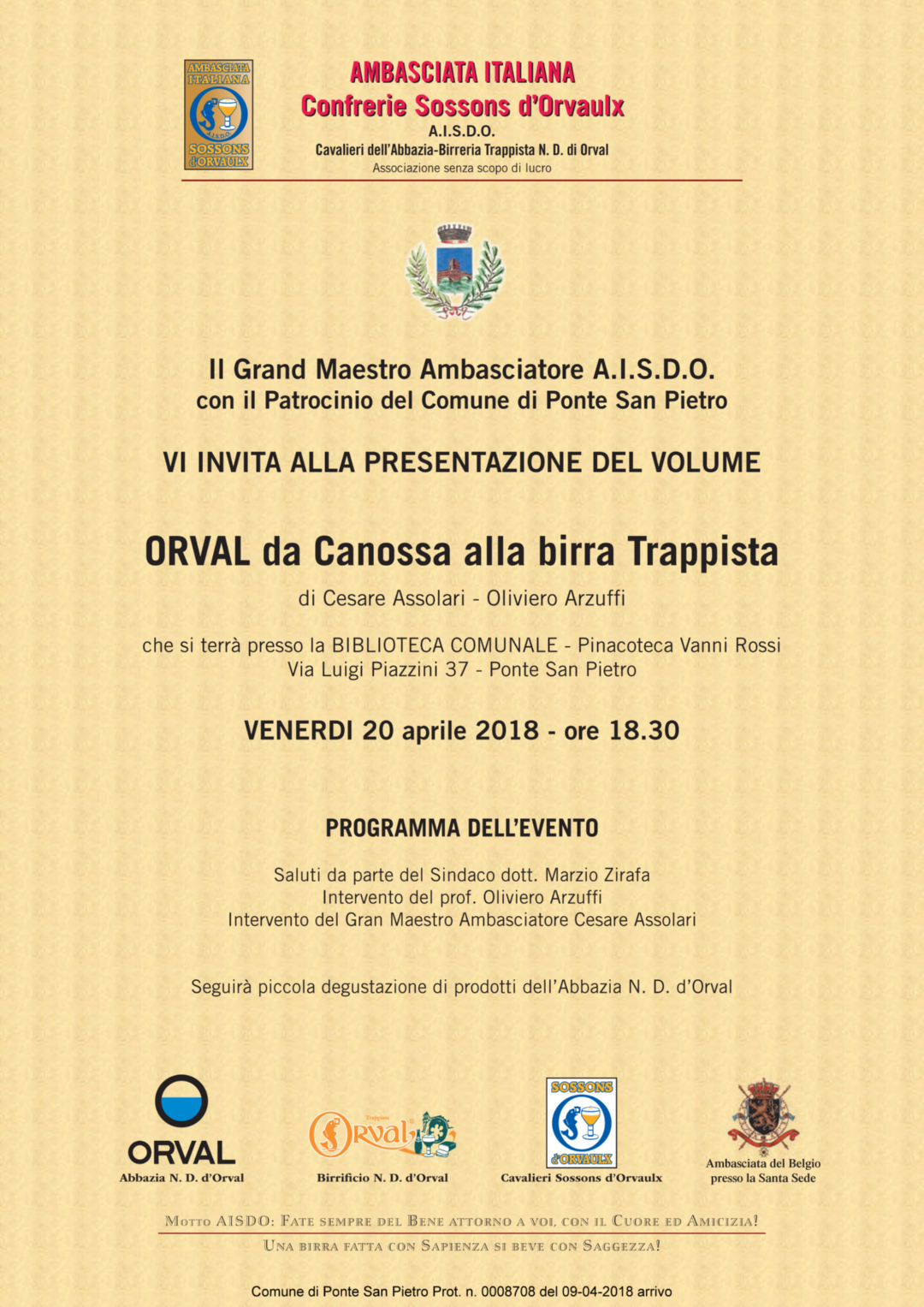 Venerdì 20 aprile alle ore 18.30, presso la Pinacoteca Vanni Rossi (Biblioteca Comunale), il Gran Maestro Ambasciatore A.I.S.D.O. con il patrocinio del Comune di Ponte San Pietro invita la cittadinanza alla presentazione del volume "ORVAL da Canossa alla birra Trappista" a cura di Cesare Assolari e Oliviero Arzuffi.