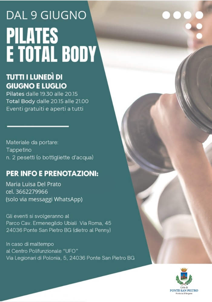 Dettagli dell'evento Gli incontri si svolgeranno ogni lunedì di giugno e luglio: Pilates: 19:30 - 20:15 Total body: 20:15 - 21:00.