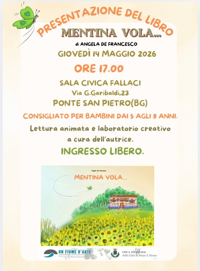 Presso la Sala "Oriana Fallaci" di Ponte san Pietro si terrà la presentazione del libro "Mentina Vola". L'evento si terrà il 14 maggio alle ore 17 ed è rivolto in particolare ai bambini di età compresa fra i 5 e gli 8 anni. Dopo la lettura è previsto un laboratorio creativo a cura dell'autrice.