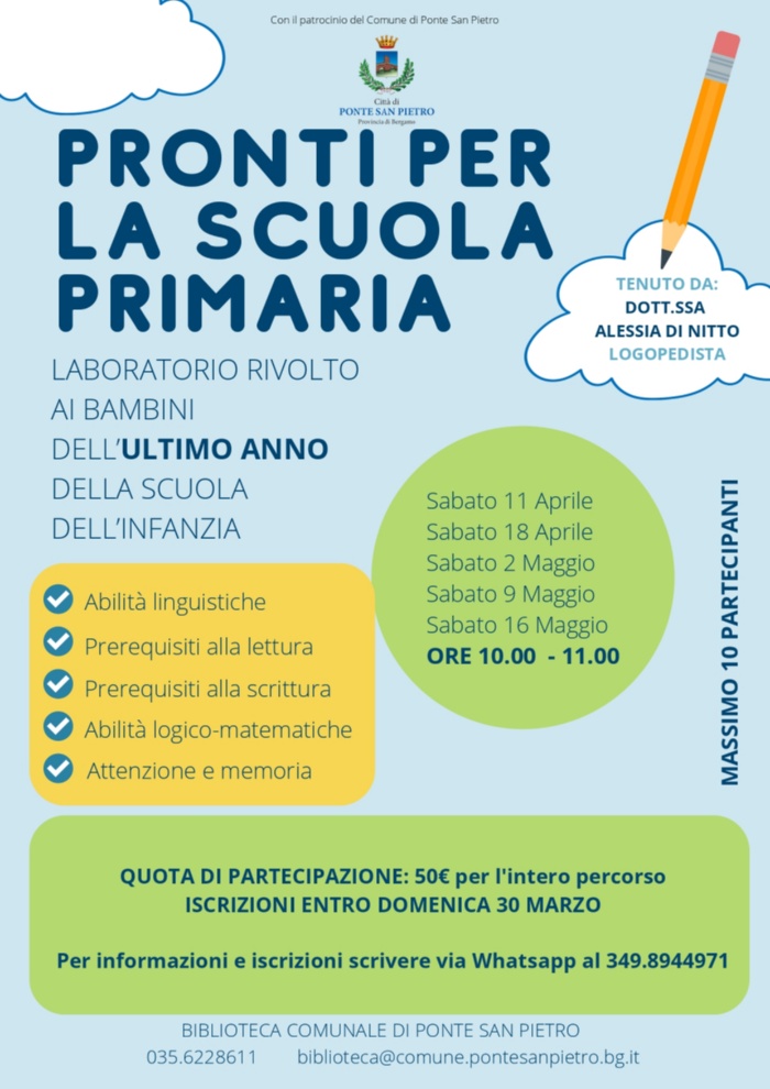 In preparazione alla scuola primaria, presso la biblioteca di Ponte San Pietro si terranno degli incontri, fra aprile e maggio, rivolti ai bambini dell'ultimo anno della scuola dell'infanzia. Gli incontri sono finalizzati all'acquisizione di abilità linguistiche, logico-matematiche e di memoria, nonché di prerequisiti a lettura e scrittura.