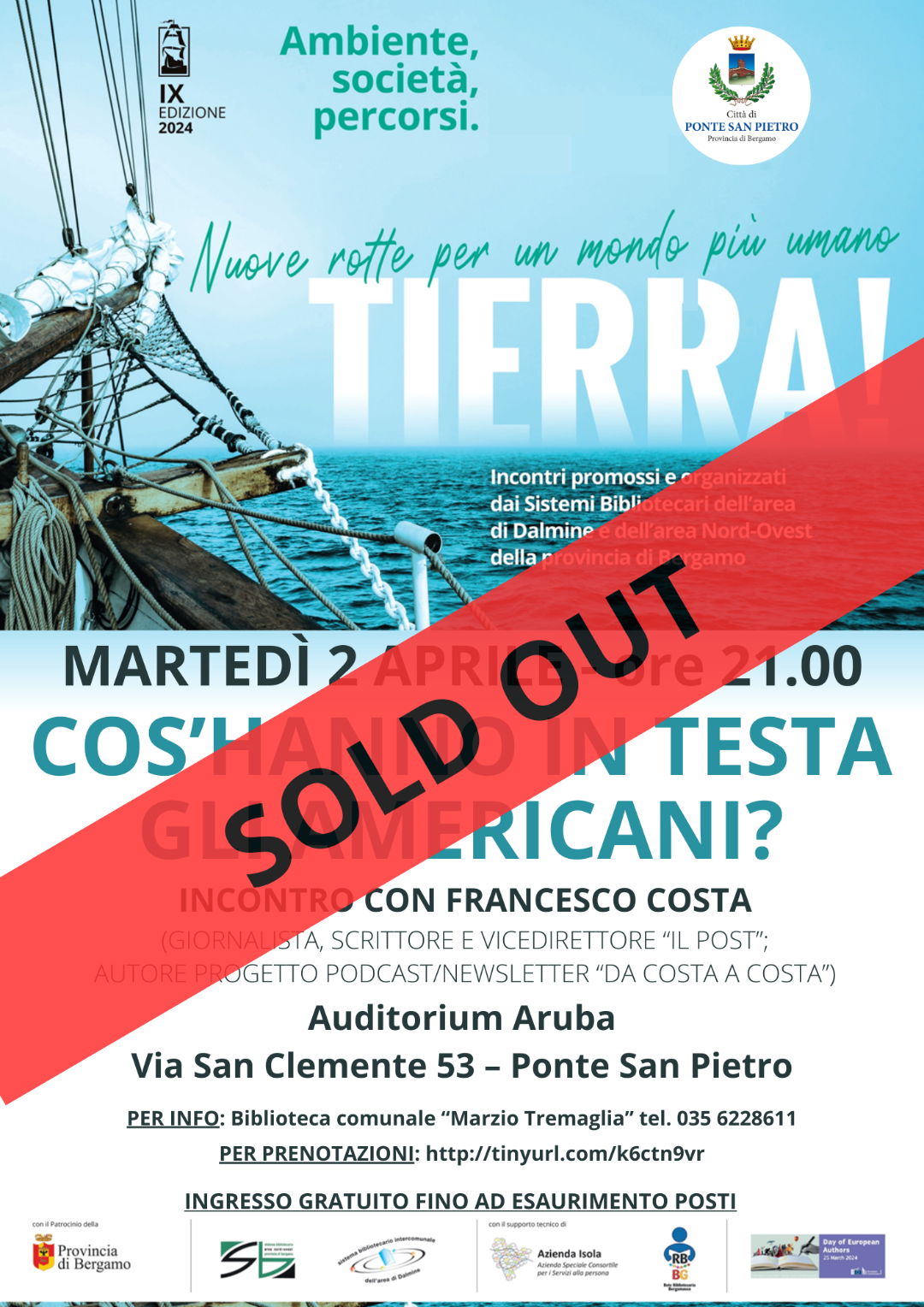 Nell'ambito della Rassegna "Tierra! Nuove rotte per un mondo più umano", martedì 2 aprile alle ore 21:00 la Città di Ponte San Pietro organizza l'incontro "Cos'hanno in testa gli americani?" con Francesco Costa (giornalista,scrittore e vicedirettore "Il Post", autore del progetto podcast "Da Costa a Costa").