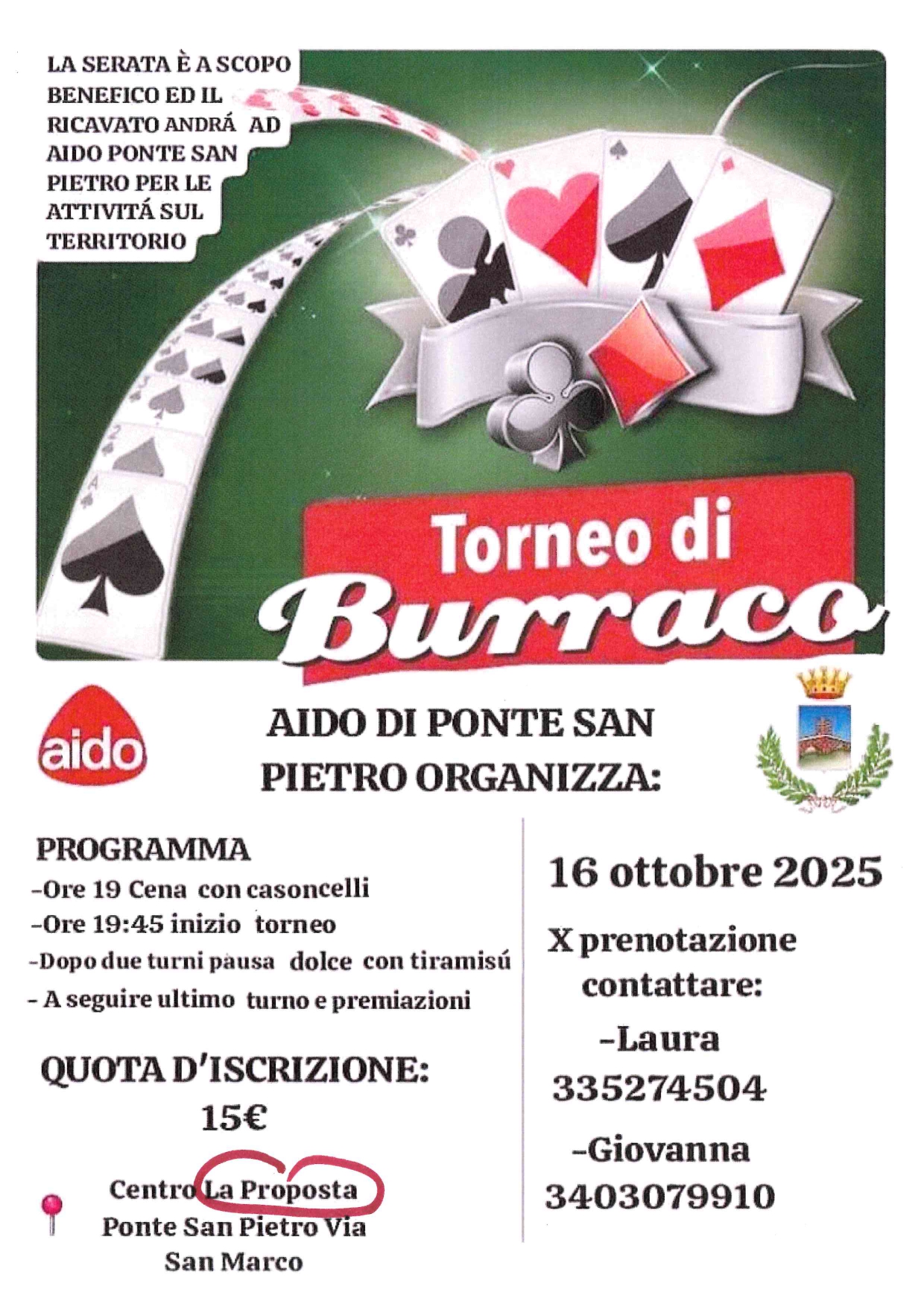 AIDO di Ponte San Pietro organizza per giovedì 16 ottobre 2025 un torneo di burraco presso il centro La Proposta, accompagnato da una cena con casoncelli.